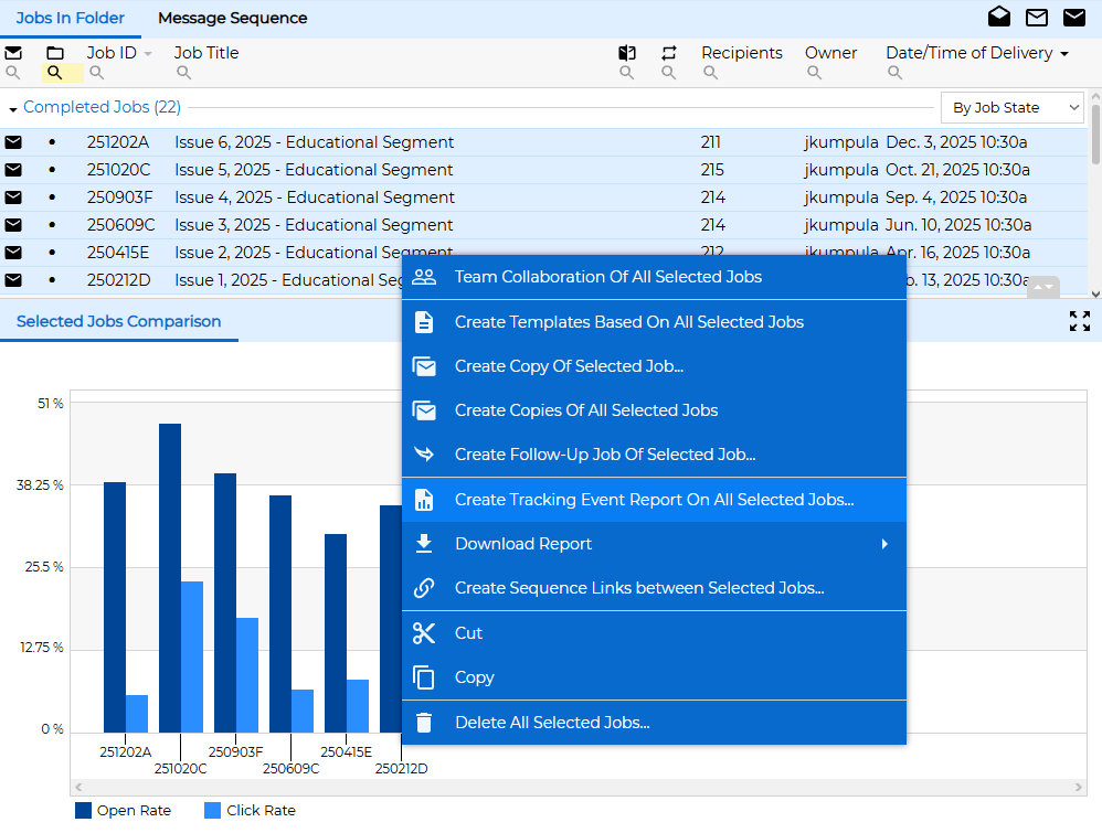 After you have started sending out frequent email campaigns, you will likely want to start creating custom reports and examining trends in your metrics. Whenever you want to create custom reports or if you want to compare the performance of multiple campaigns, go to "Mail Jobs" and highlight the jobs that you'd like to include in your report. Then right-click and choose the "Create Tracking Report on All Selected Jobs" option.