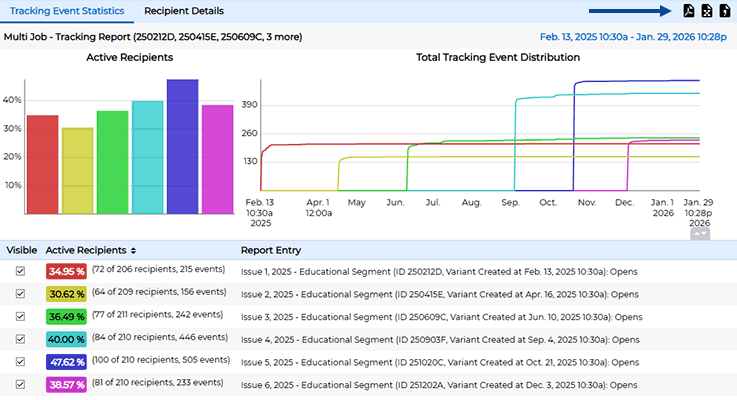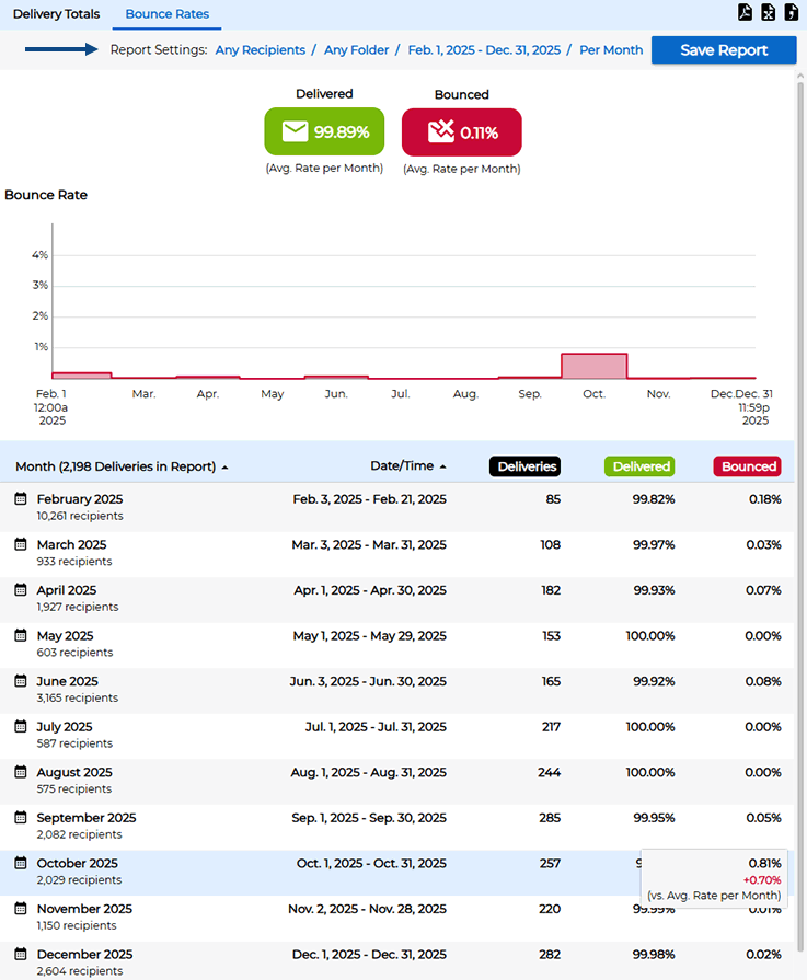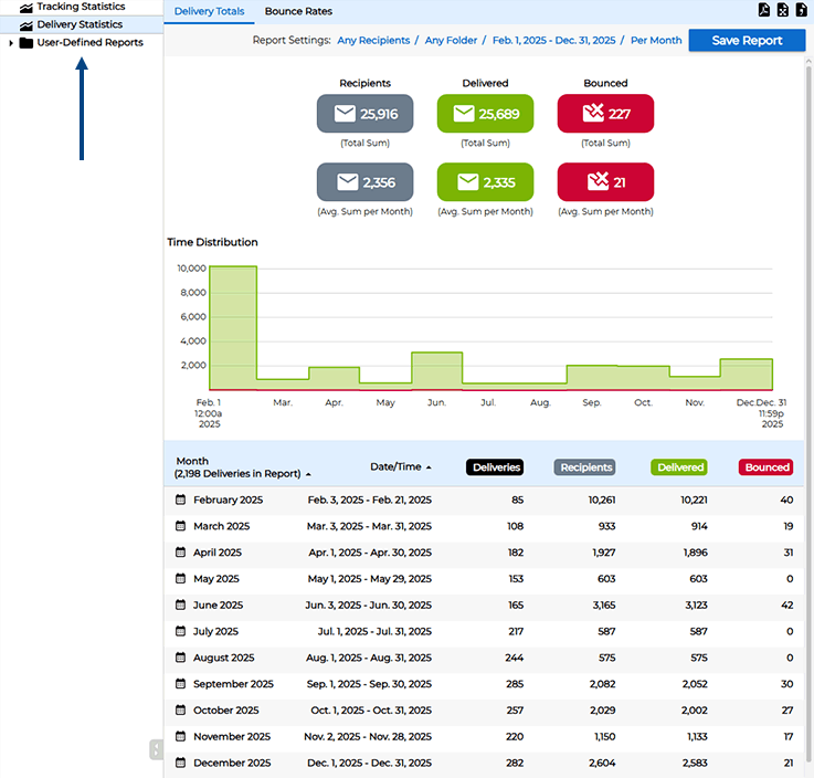 To examine trends and get performance metrics on all of your email campaigns over time, use the main menu and click on "Reports". On the left side of the screen, you will notice two automatically generated reports called "Tracking Statistics" and "Delivery Statistics". The delivery report shows the average delivery and bounce rates for all of your mail jobs over time. The "Delivery Totals" tab shows the total number of delivered and bounced messages, while the "Bounce Rates" tab shows percentages.