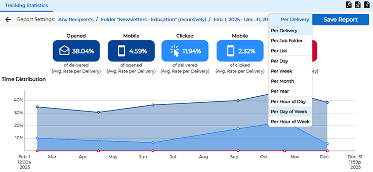 The flexible filtering options allow you to dig deeper and pinpoint the optimal delivery days and times to engage your subscribers. To do this, click on the "Per Delivery" filter at the top of the screen. You'll notice that there are many additional options. Instead of looking at each individual mail job, you can choose to break down your engagement metrics per month, week, day of the week or hour of the day.