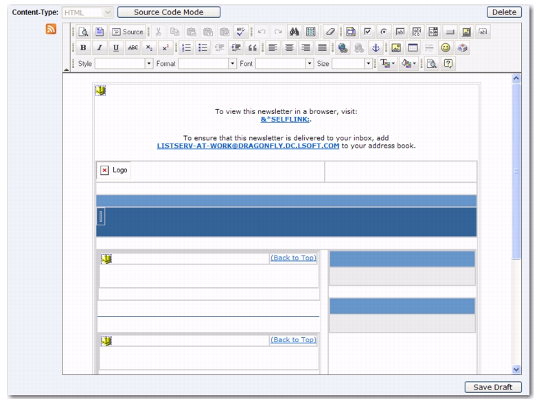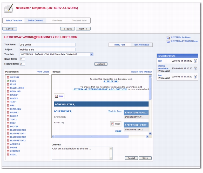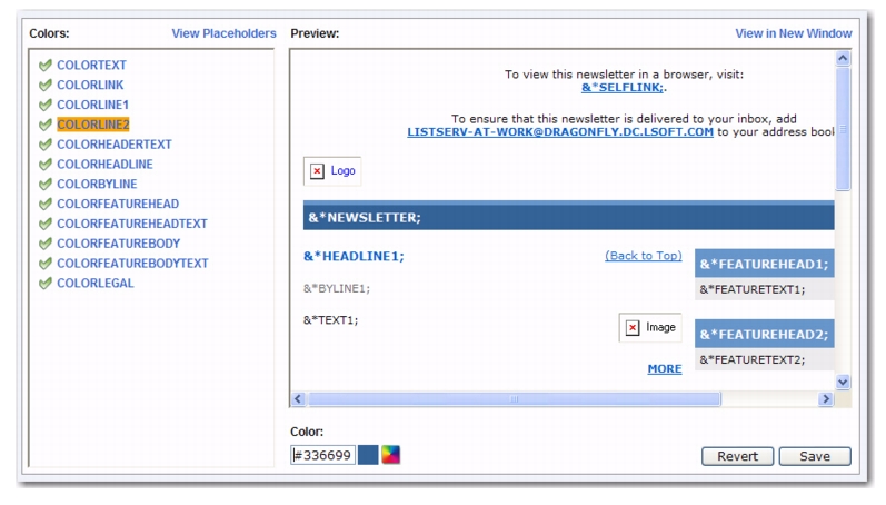 You can now create professional-looking HTML newsletters with or without HTML coding experience. LISTSERV comes with ready-to-use newsletter templates that contain placeholders that, when selected in the template designer, will let you fill in predefined areas with your own text and/or images.