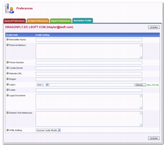 To edit the profile for all of the newsletters, click on the Edit Newsletter Profile option. The Edit Newsletter Profile screen opens, which is where you can enter any changes you’d like to make to your newsletter profile. These changes will be applied to the entire newsletter template gallery and will be associated with your user account only.