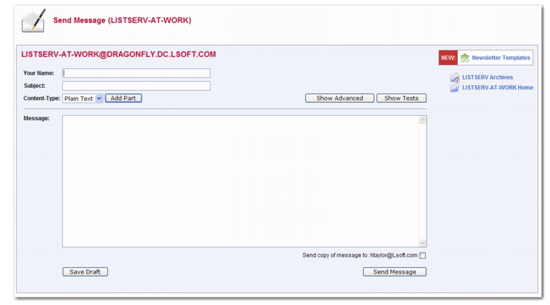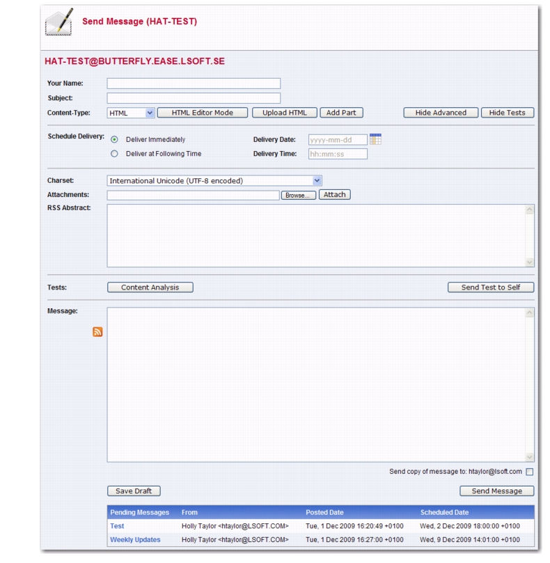 Send Test to Self – When constructing an email message and before sending it to your list, you can use this button to send a test message to yourself to make sure that the results are satisfactory. LISTSERV will send a copy of the message to the email address that you used to log in to the Web interface. This kind of test delivery can be particularly useful when creating HTML newsletters or multi-part messages. Email clients vary in their degree of HTML support. Sending a test message allows you to double-check that the message is rendered as you intended. If necessary, you can make adjustments to your message before posting it to the list.