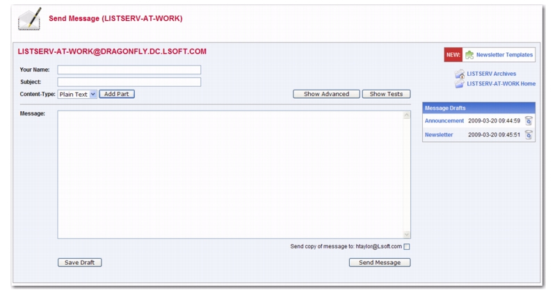 Save Draft – If you have started working on an email message or newsletter and want to continue at a later time, you can click the [Save Draft] button to save a draft of the message. The subject line, the text part, and the HTML part (if applicable) are all stored. However, advanced options, such as attachments and RSS abstracts are not stored with the draft. The drafts, which are identified by their subject lines and shown with a timestamp, will be listed in a table on the right side of the screen. When you return to the Send Message screen, you can just click on the subject line to retrieve the draft. As a safety measure, LISTSERV automatically saves and updates drafts every time the message posting interface is refreshed. To delete existing drafts, just click on the Recycling Bin icon next to the draft that you want to erase. Existing drafts are deleted automatically when you post them to the list.