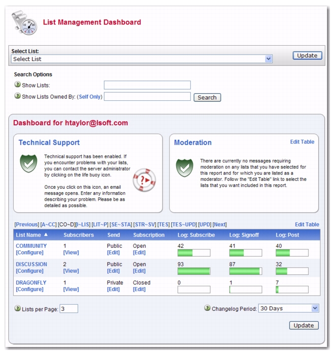 The List Reporting section and the List Management Dashboard now has a Self Only option for server administrators. This option lets the server administrator modify the lists displayed so that only the lists owned by the administrator are displayed.