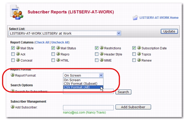 Note: For reports that span multiple pages, the CSV Format (Subset) option will only include data from the current screen in the report. For example, if a list contains 100 subscribers but only 50 subscribers are shown on screen at a time, then the CSV file will only contain the 50 subscribers shown on screen. Also, if you are using any narrowing options, only the data that fits the search criteria is included in the CSV file. The CSV Format (All) option, on the other hand, will include all the data in the CSV file regardless of the number of pages or any search or narrowing options.