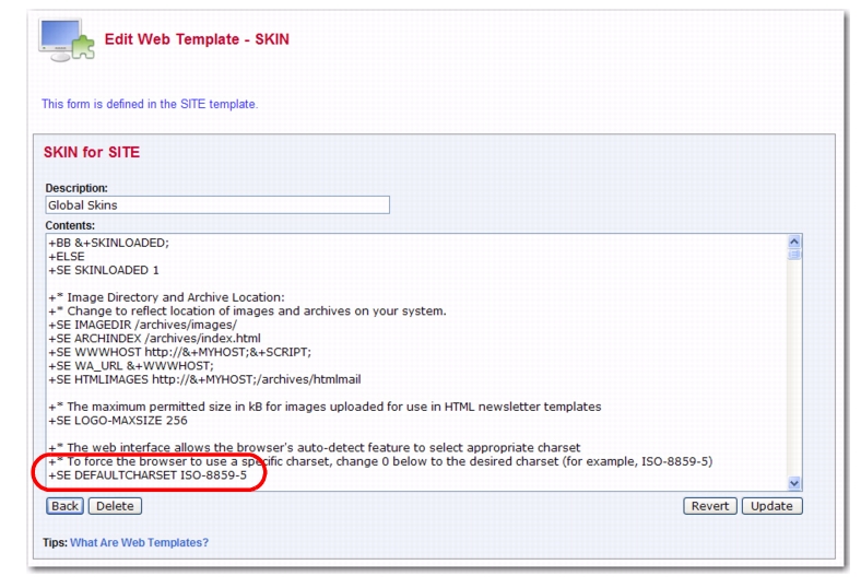 To change this variable for a specific list, click on the List Management menu, select Customization, and then select Web Templates. Select the list you’d like to work with, and then search for the Global Skins template by entering either Global Skins or SKIN in the Search Template field and click [Search]. Edit the template by changing DEFAULTCHARSET to the desired character set.