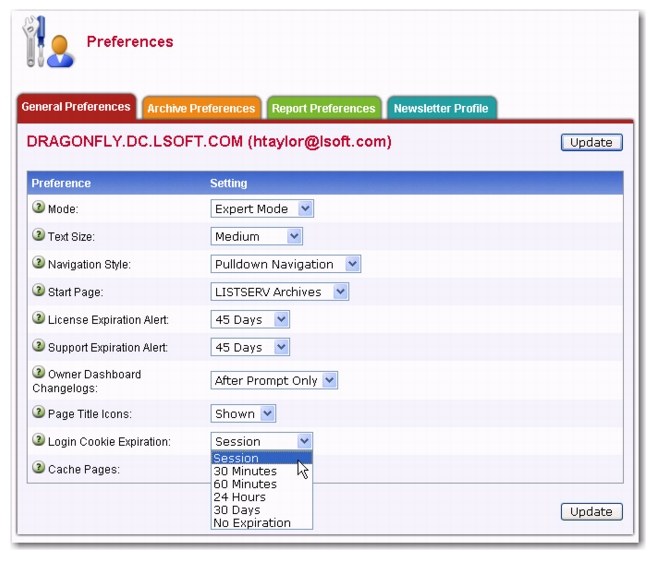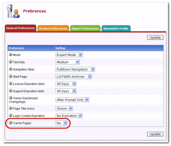 LISTSERV now allows you to select whether or not you want recently visited pages of the Web Interface to be cached in your browser. The default is No, which provides extra security, especially if you are working on a shared computer.