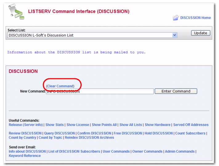The LISTSERV Command Interface now has a Clear Command option, making it easy to clear a command so you can issue multiple commands in a sequence. To access the Command Interface, click on the Server Administration or List Management menu from the Toolbar, and then click LISTSERV Command.