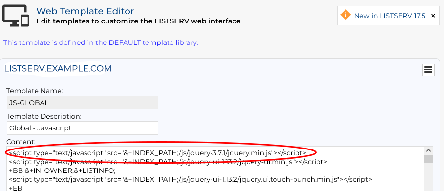 3.Update the JS-GLOBAL web template under Server Administration/Web Templates to use this version rather than the older version (this is set in the first line of the template).