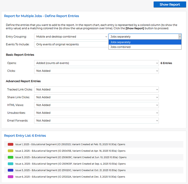 After you have started sending out frequent email campaigns, you will likely want to start creating custom reports and examining trends in your metrics. Whenever you want to create custom reports or if you want to compare the performance of multiple campaigns, go to "Mail Jobs" and highlight the jobs that you'd like to include in your report. Then right-click and choose the "Create Tracking Report on All Selected Jobs" option.
