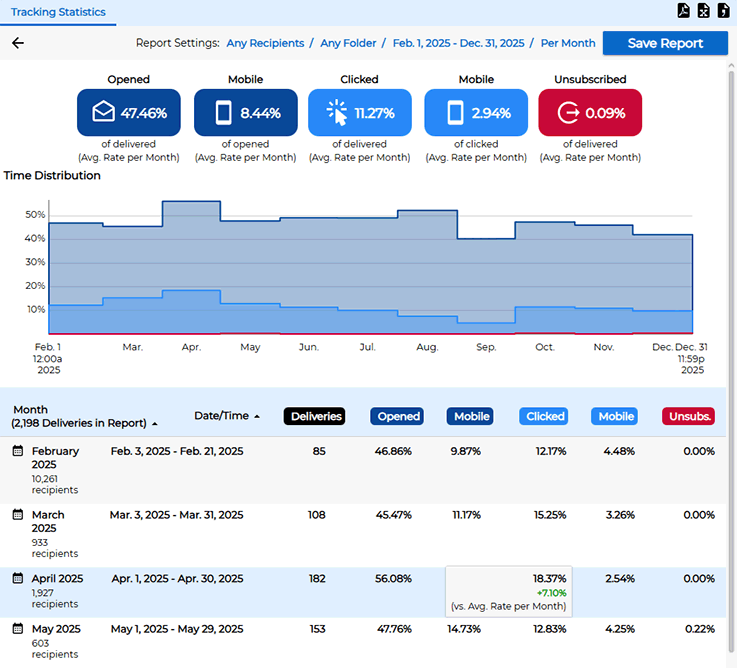 You can sort the table by date, open rate, click rate or unsubscribe rate, making it easy to locate the best and worst performing campaigns. You can also click on the name of each mail job to take a closer look at the performance metrics for that job.