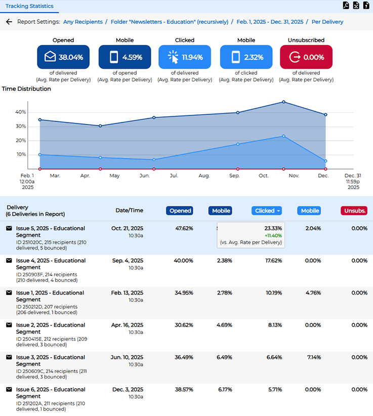 To examine trends and get performance metrics on all of your email campaigns over time, use the main menu and click on "Reports". On the left side of the screen, you will notice two automatically generated reports called "Tracking Statistics" and "Delivery Statistics". The delivery report shows the average delivery and bounce rates for all of your mail jobs over time. The "Delivery Totals" tab shows the total number of delivered and bounced messages, while the "Bounce Rates" tab shows percentages.