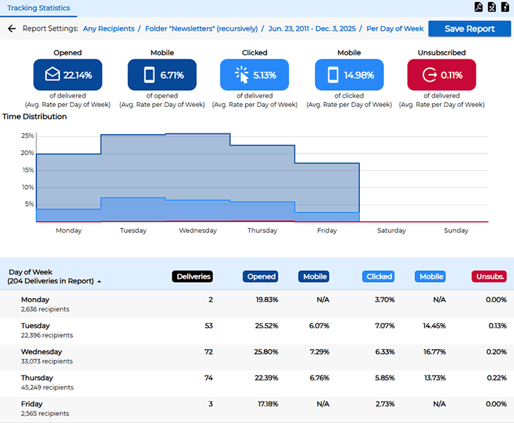 For example, if you select the "Per Day of Week" option, you can easily see what weekdays have the highest and lowest engagement metrics, which can inform you when to send future email campaigns for best results.